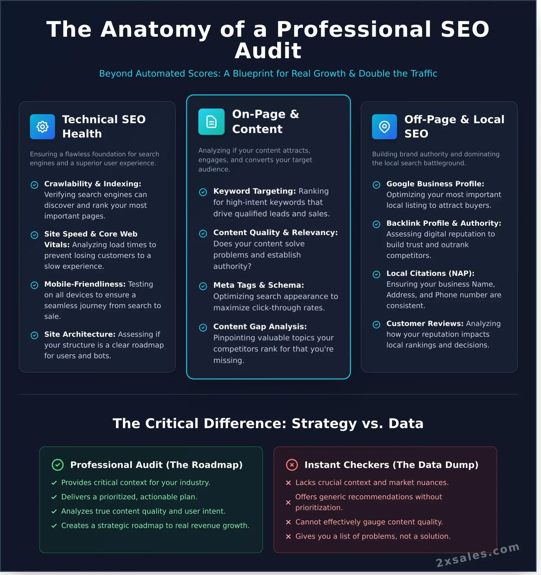 A comprehensive SEO audit is the diagnosis of your website’s health. But a diagnosis without a cure is just a list of problems. At 2X Sales, we don’t just deliver data; we deliver a results-driven action plan. Our free seo audit is the critical first step in building a growth engine that transforms technical findings into tangible business outcomes and shatters your revenue goals.