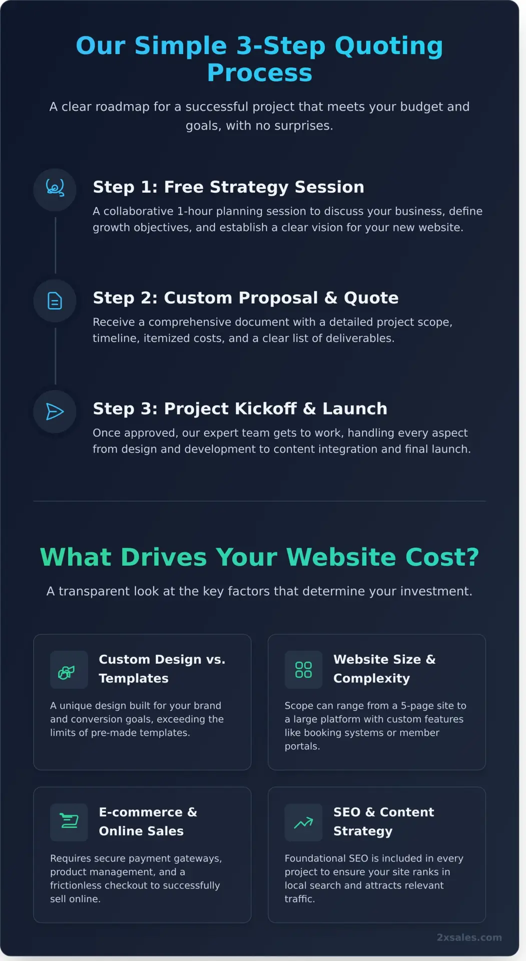 We believe in clarity and efficiency. Our process is designed to make getting a detailed, actionable quote for your web design project fast and easy. With 2X Sales, there are no surprises—just a clear roadmap for a successful project that meets your budget and goals.
