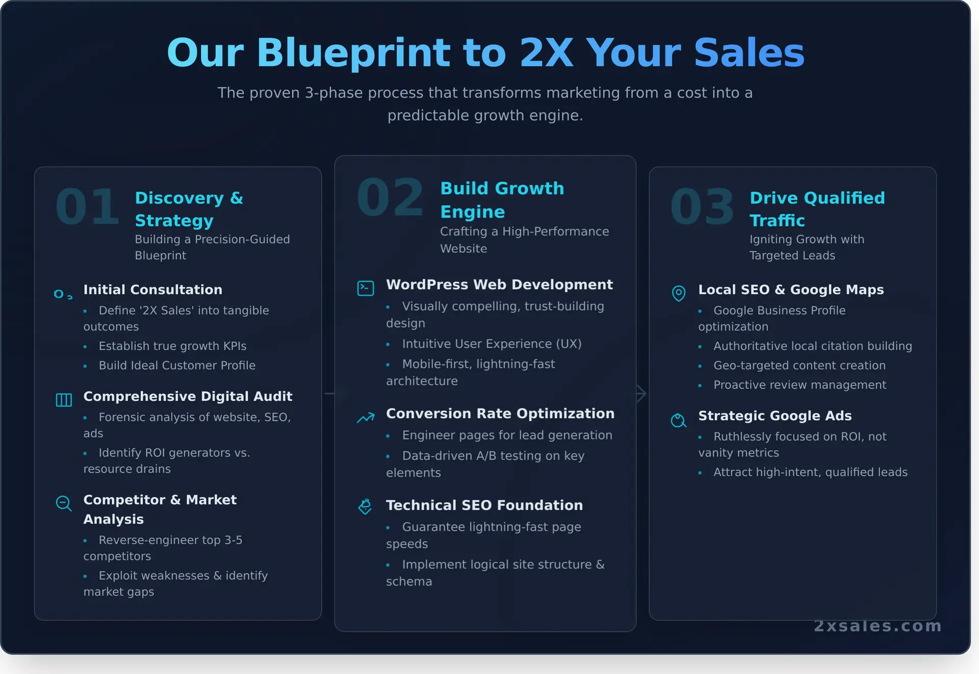 - Define ‘2X Sales’: We translate this bold objective into tangible, measurable outcomes specifically for your business model, whether that means more leads, higher transaction values, or increased customer lifetime value.