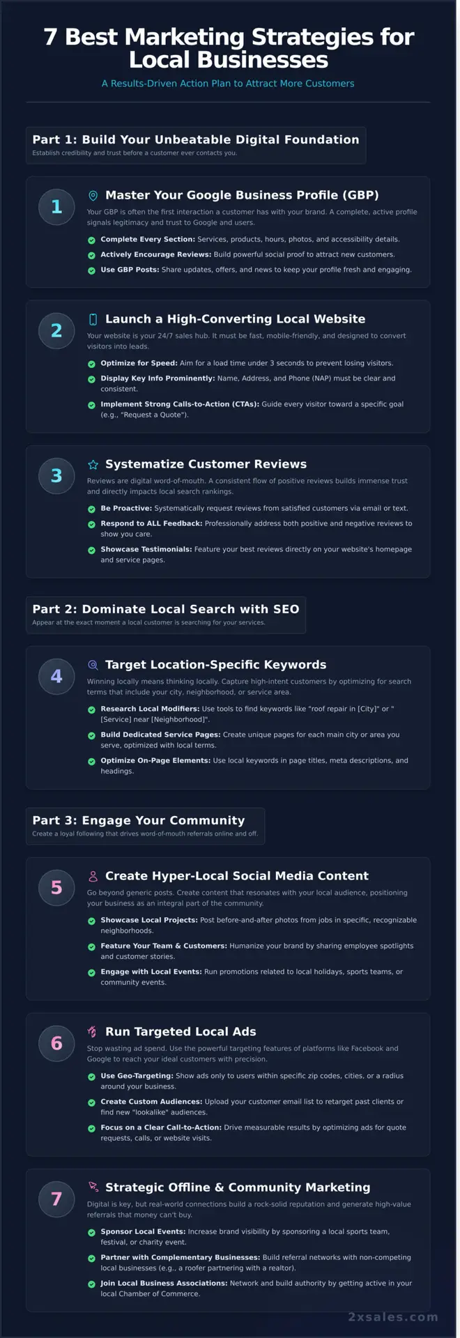 Ultimately, the best marketing strategies for local business success combine a powerful digital foundation with smart, community-focused offline tactics. This integrated approach doesn’t just find customers-it creates loyal advocates for your brand. If you’re ready to build a comprehensive strategy that drives real growth, our team at 2X Sales is ready to help.