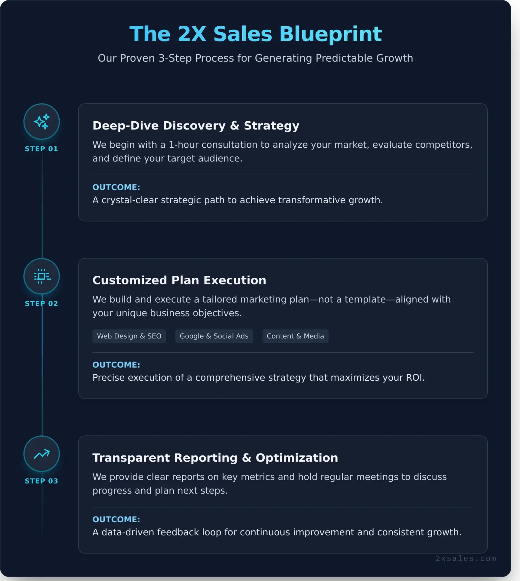 Results don’t happen by accident; they are the product of a disciplined, strategic framework. At 2X Sales, we’ve abandoned guesswork and improvisation in favor of a proven, three-step process designed to deliver consistent, repeatable growth. This blueprint demystifies how we work, setting clear expectations from day one and ensuring every action we take is a calculated step toward doubling your sales. This is what sets us apart as a marketing agency Spokane businesses trust for tangible outcomes.