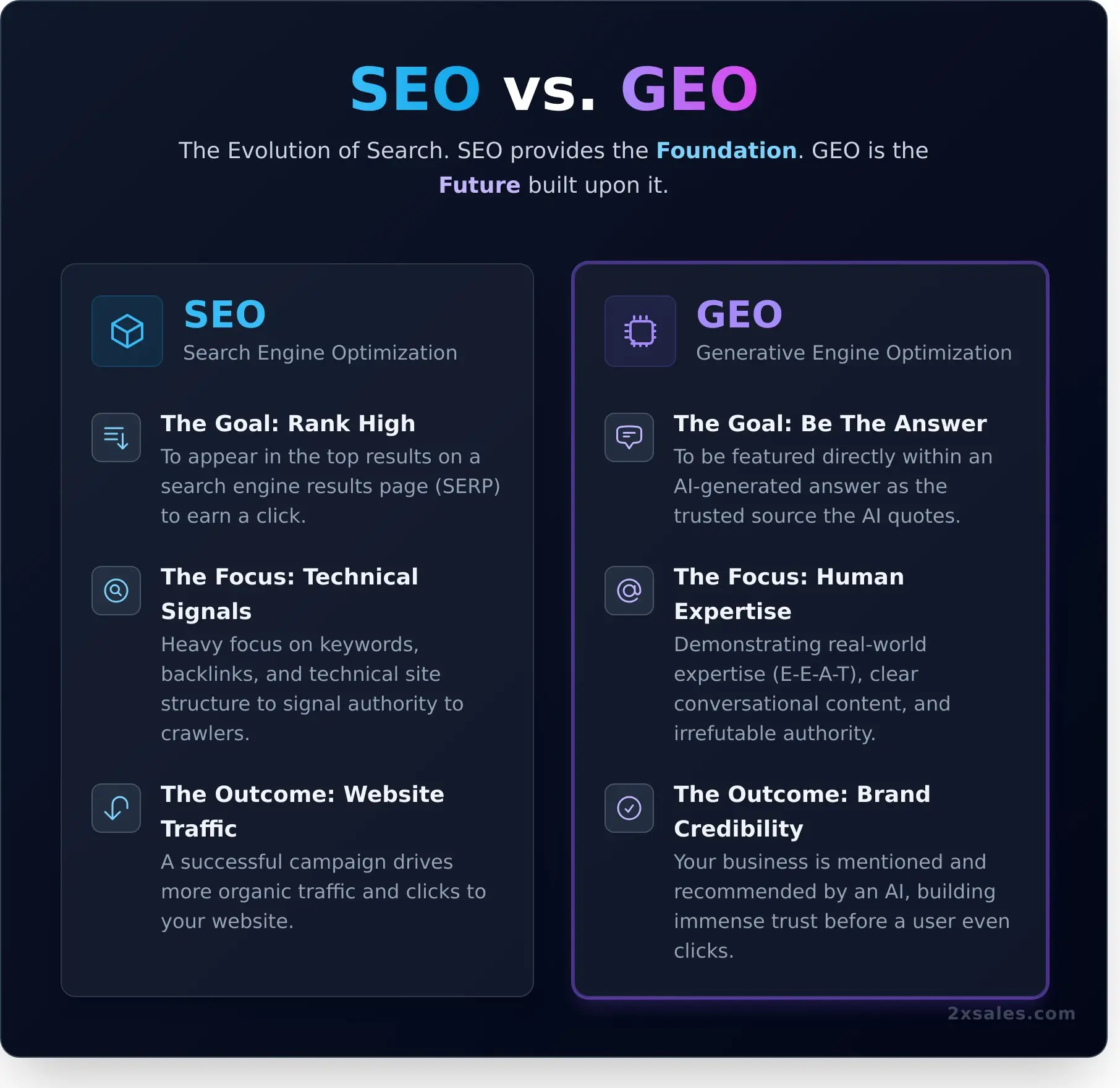 - The Outcome: A successful SEO campaign results in more organic traffic to your website. A successful GEO campaign results in your business being mentioned and recommended by an AI, building brand credibility before a user even decides to click.