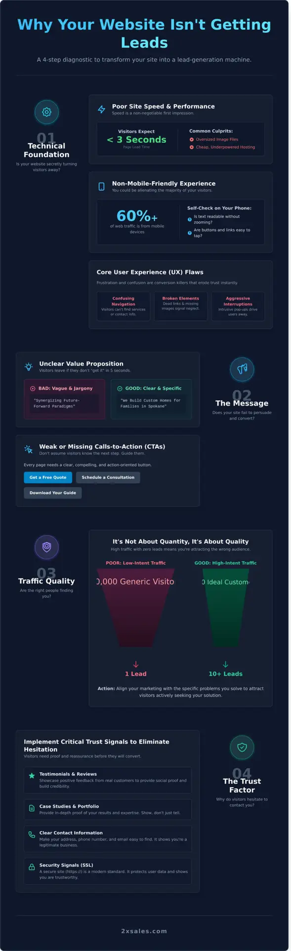 - The solution to “my website isn’t getting leads” often lies in your traffic quality, not just quantity; discover how to attract high-intent visitors.